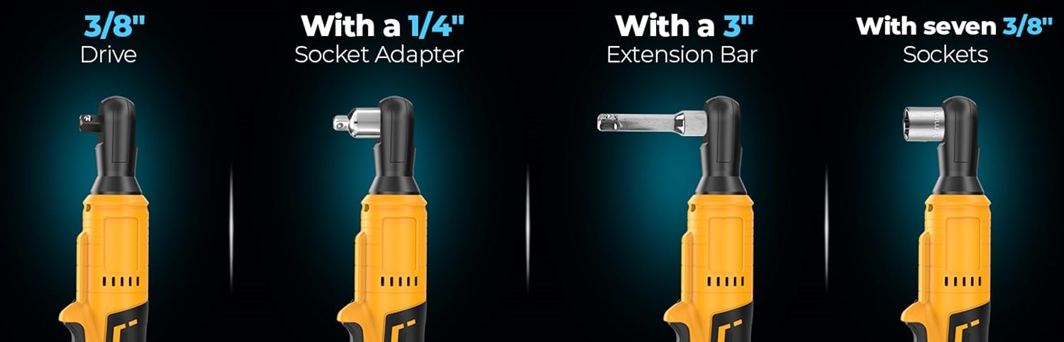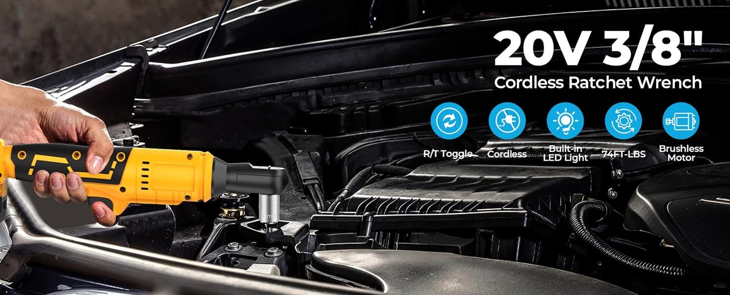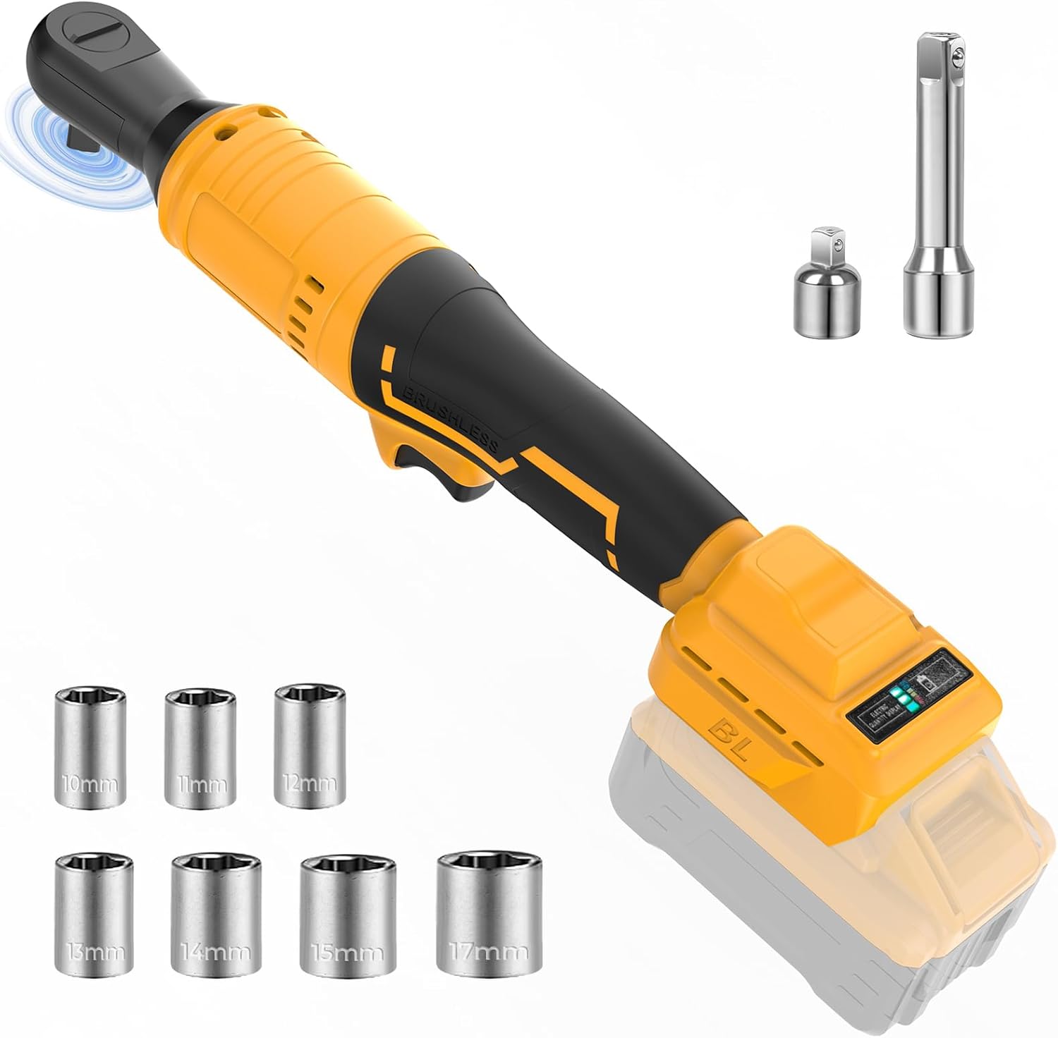 3/8 Cordless Ratchet Wrench Compatible With Dewalt 20V MAX Battery(No Battery) 74Ft-Lbs Brushless Ratchet Wrench with 7CS Sockets.1/4 Adapter.3 Extension Bar