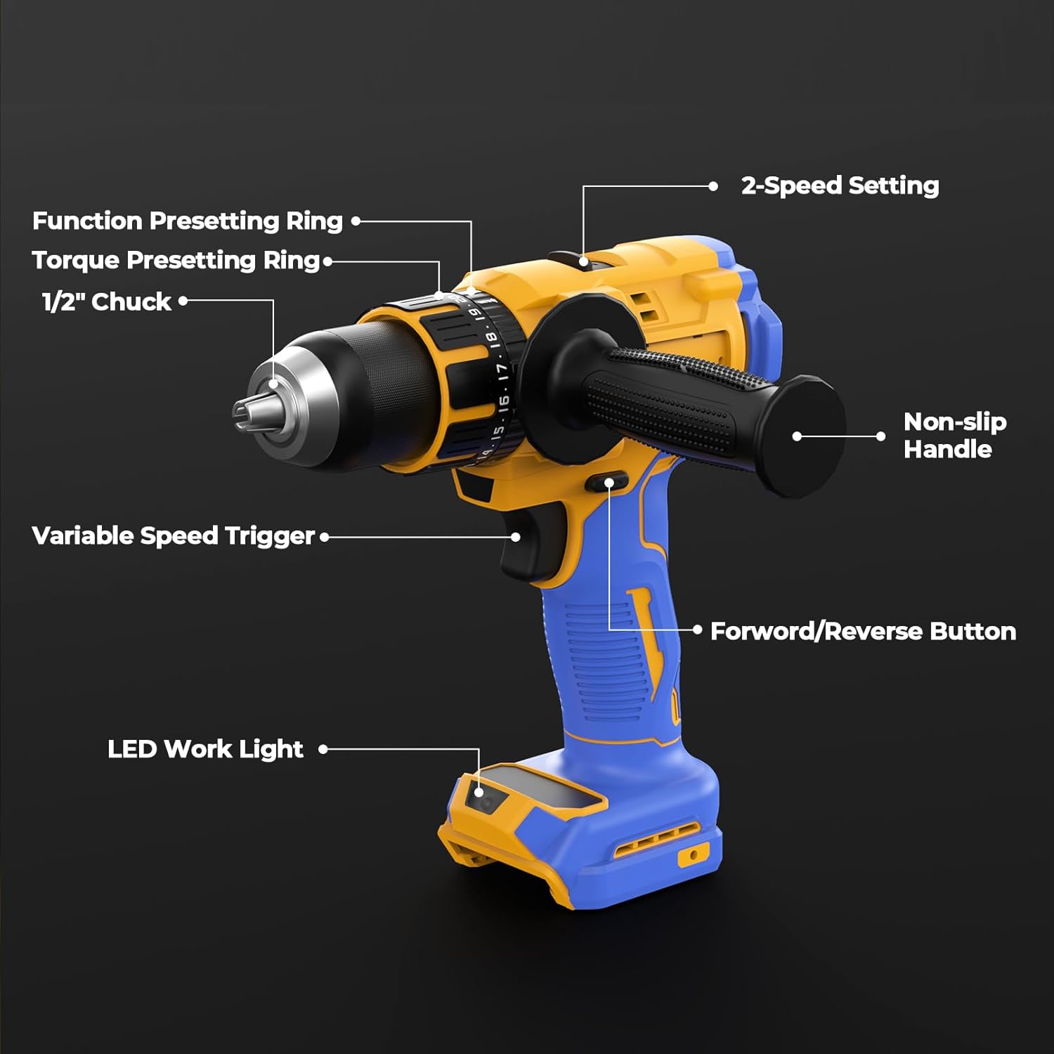 Cordless Hammer Drill Compatible with Dewalt 20V Max Battery(No Battery) Electric Drill with Brushless Motor. 1/2 Keyless Metal Chuck.4pcs Bit for Drilling Brick Wall. Metal. Wood. Screws