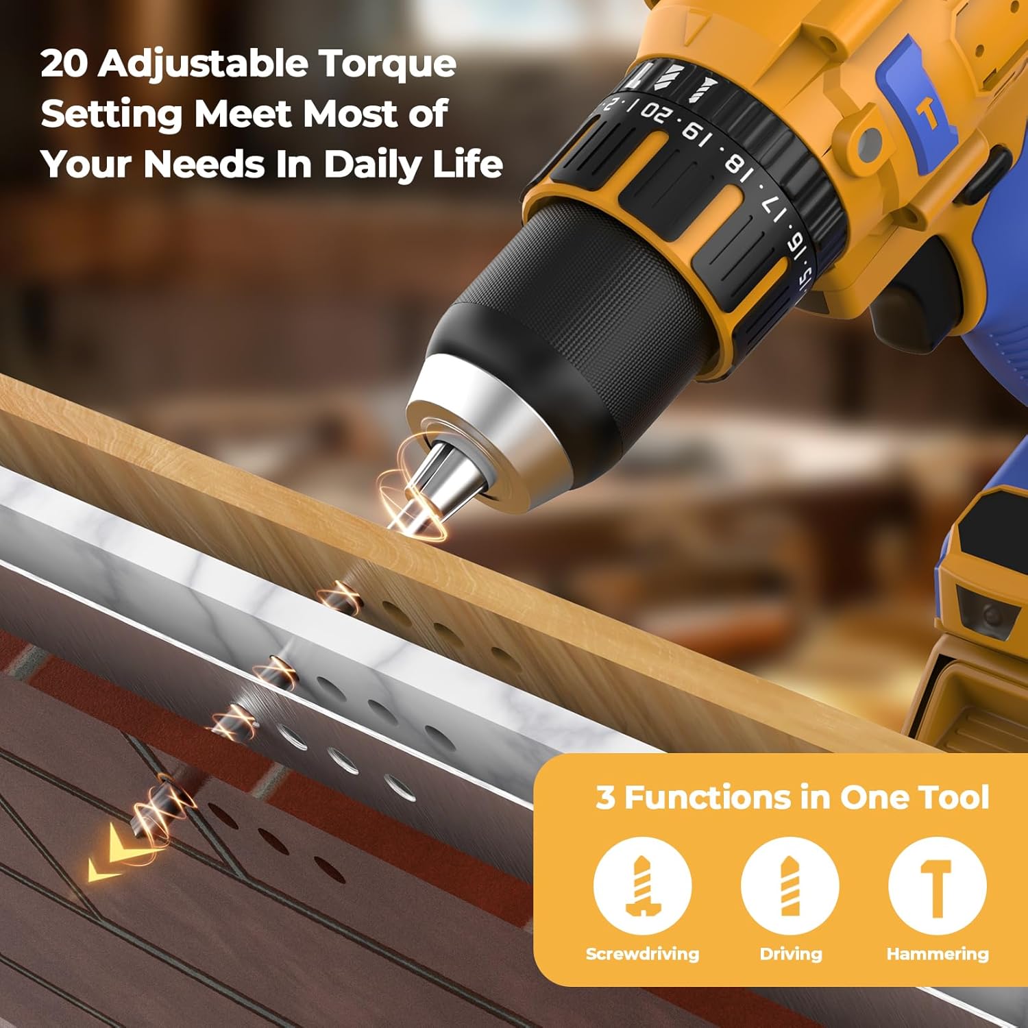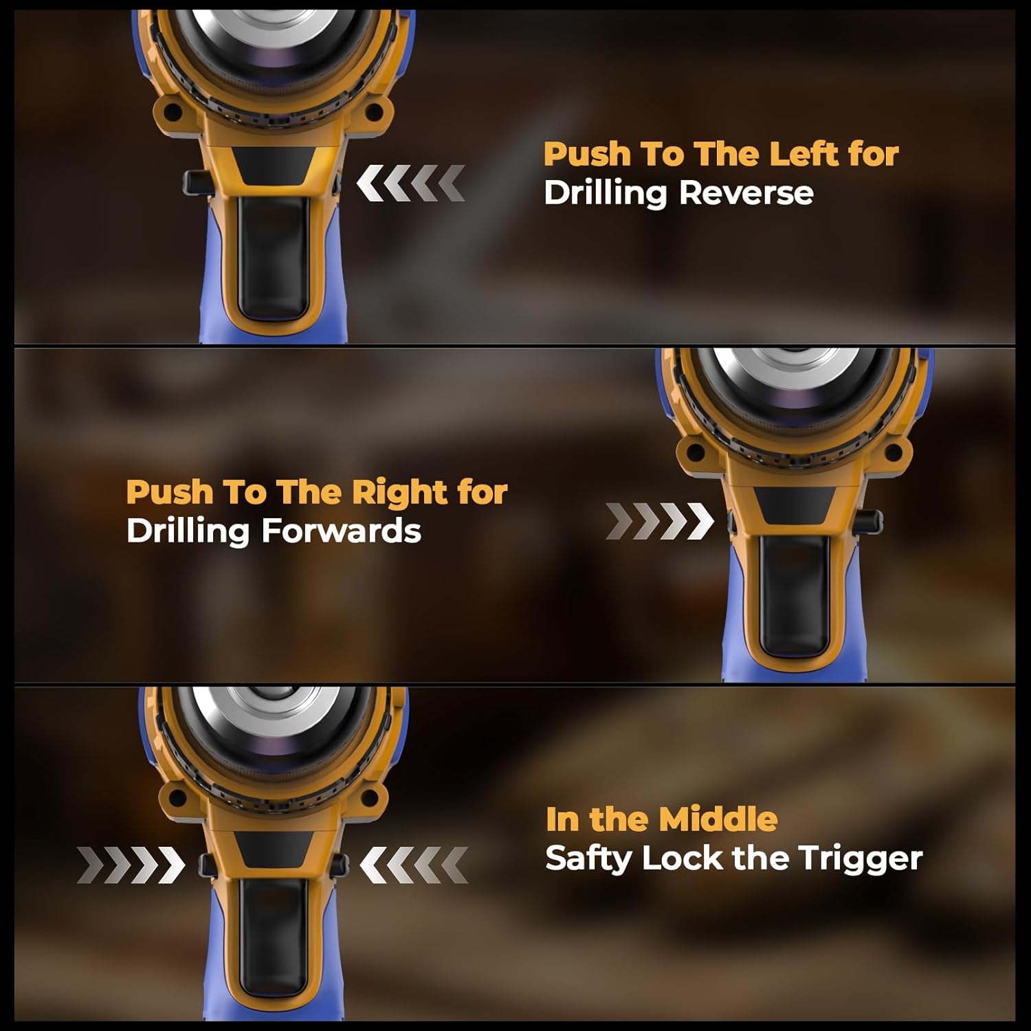 - 【Ergonomic and Lightweight】Keep your hands on the power drill with a shock-proof and non-slip handle and an additional handgrip for a comfortable grip. Easily switch between left and right-handed operation to reduce fatigue during use. In addition. with its LED working light. you can work easily in low-light conditions at night