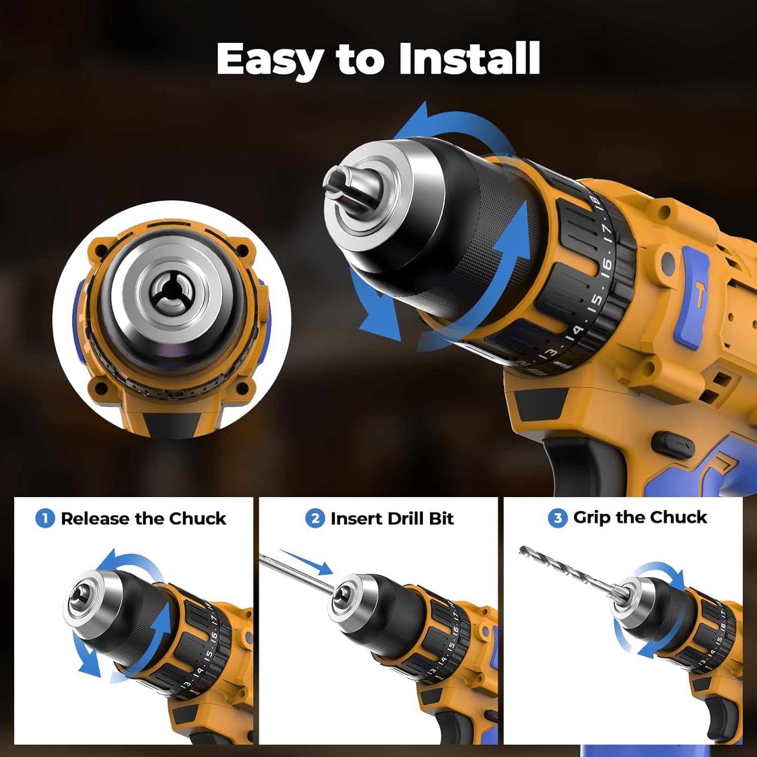 - 【Variable Speed】1/2 inch keyless metal chuck electric drill provides a fixed rock grip.2 Variable Speed Electric drill tool gives DIY projects or professional endeavors to unlock the possibilities of working with different materials and using a wide variety of drill bits. Low speed for tightening/loosening screws and high speed for drilling and impact drilling