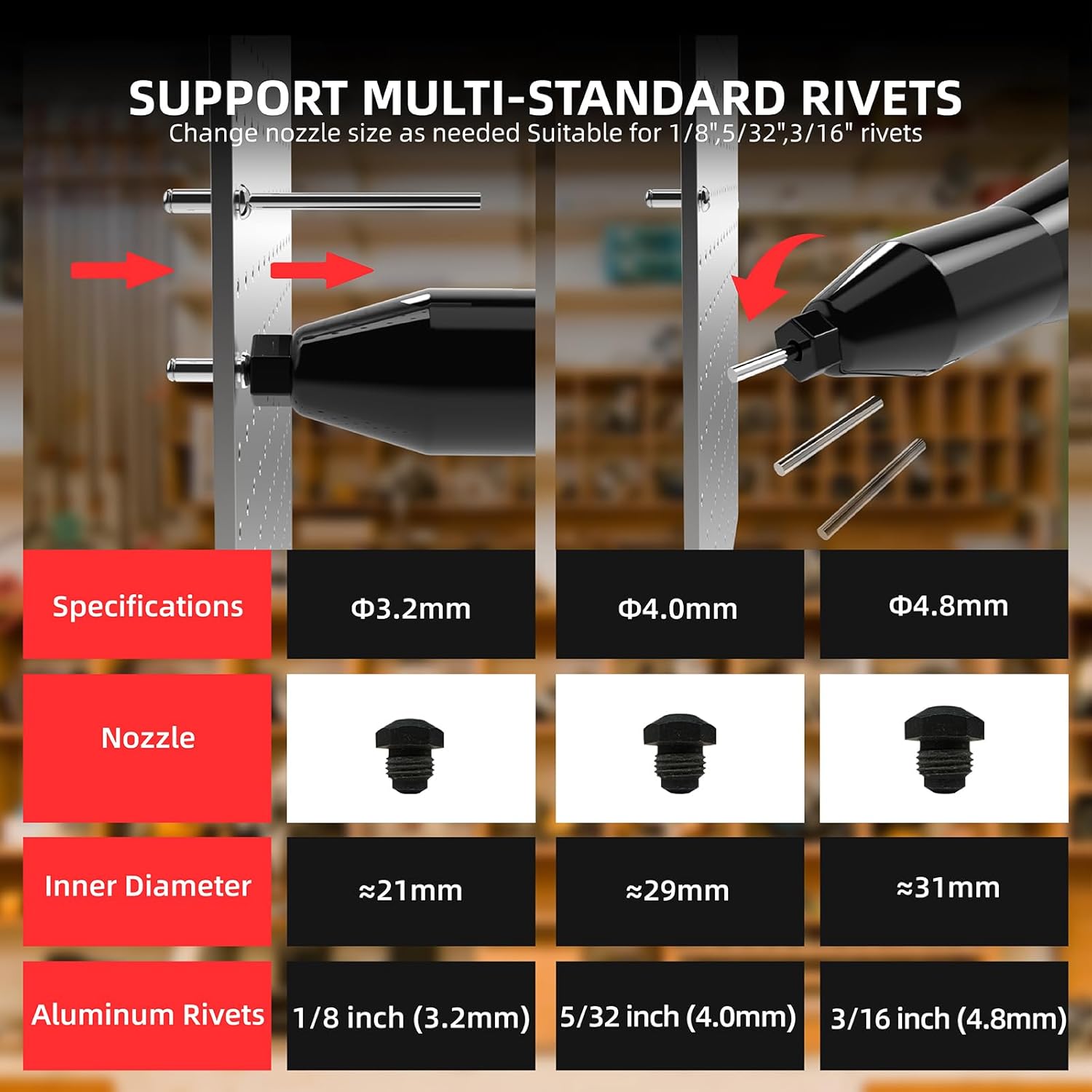 Cordless Rivet Gun, Compatible with Milwaukee M18 18V Battery (No Battery), Brushless Motor, 3/16", 5/32", 1/8" Rivets, 1000 RPM, 18V DC, Red