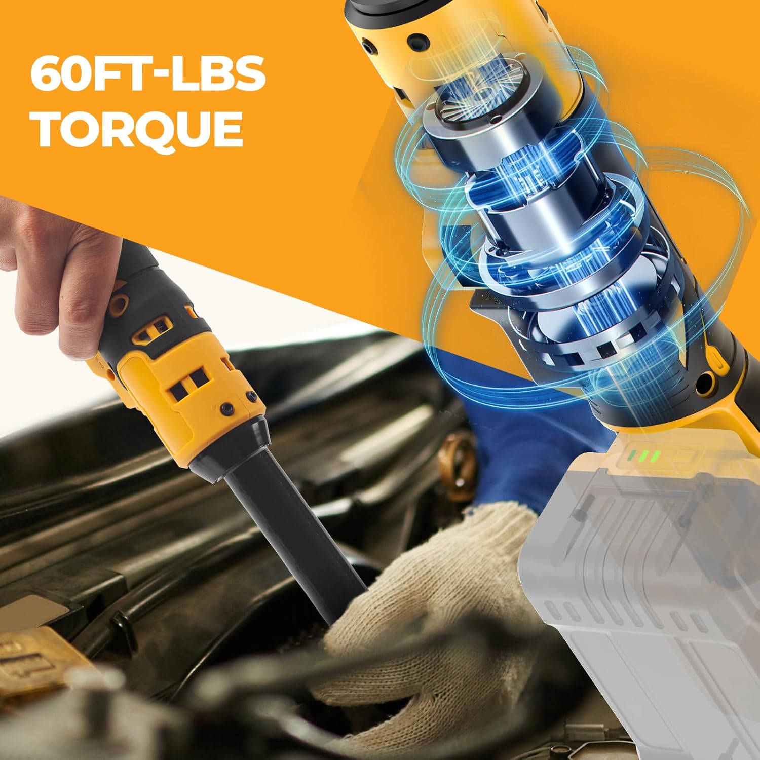 - 【Powerful Motor】3/8 Cordless ratchet wrench can deliver 60ft-lbs max torque to remove or install bolts (or nuts) effortlessly and quickly. Perfect for different kinds of application. This ratchet wrench fits for automotive machinery. mechanical repair. scaffolding installation. furniture assembly etc.