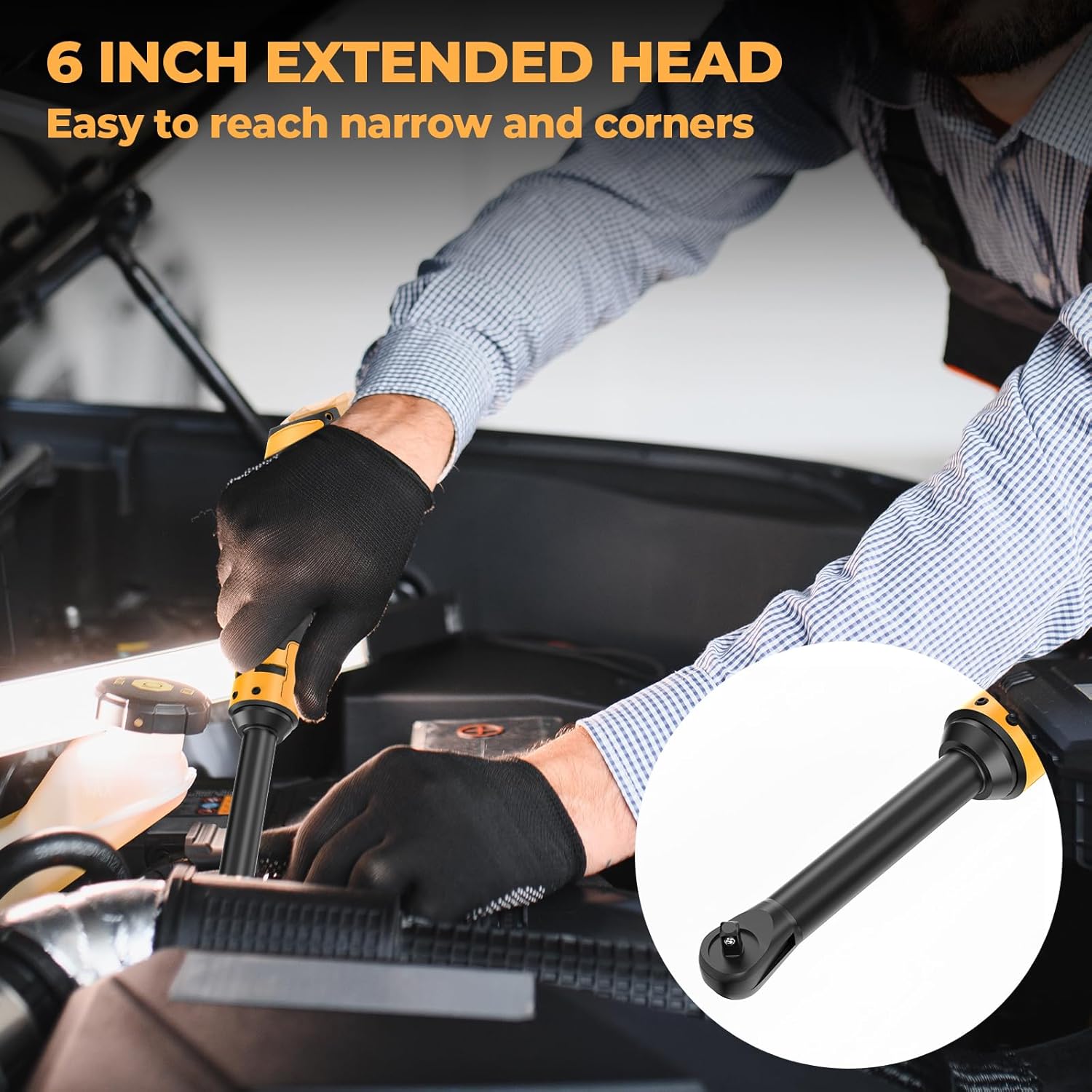 Extended 6-inch long neck with a slim 3/8-inch head. which enables it to easily enter any narrow or hard-to-reach nut position. allowing you to perform repair and maintenance work more conveniently.