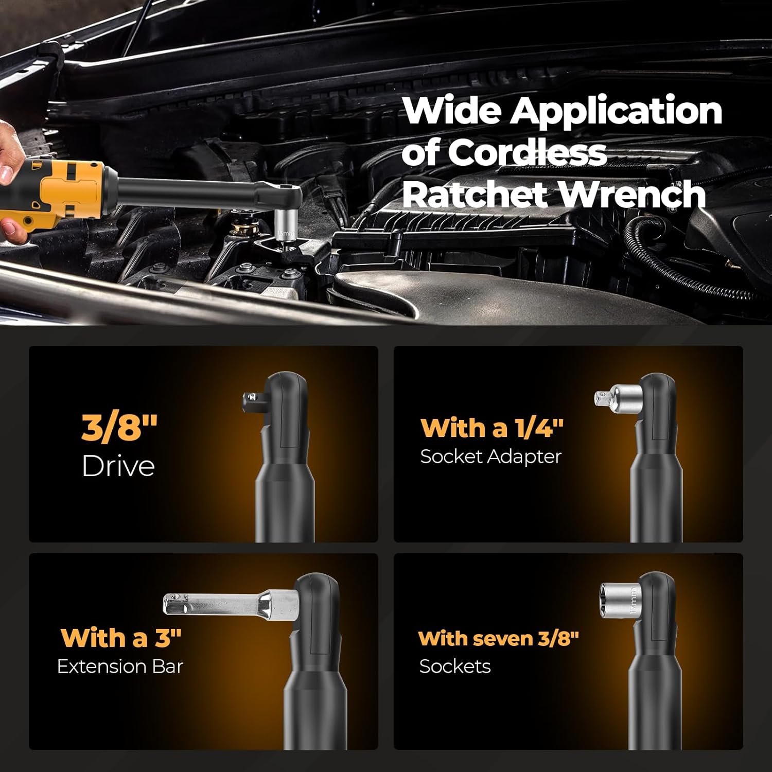 - 【What Will You Get】This cordless ratchet wrench kit comes with 7 Different size socket(17mm.15mm.14mm.13mm.12mm.11mm.10mm). a 3/8 to 1/4 drive adapter and a 3-inch extension bar which can easily access to small and deep spaces for screw removal and install