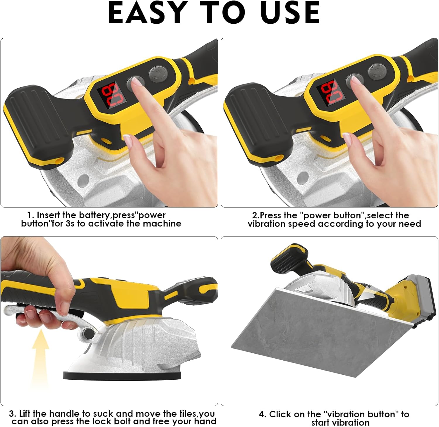 - 【5 Suction Cup.Strong Adsorption】Equipped with suction cups with a diameter of 5.this tile vibration tool can provide a maximum adsorption force up to 110 Lbs.it is suitable for wall & floor tiles/thick glass with a size of 11.81-102.36.